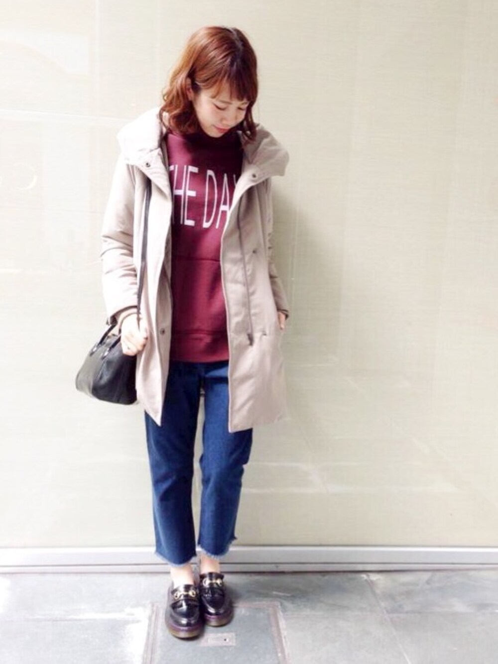毎年人気のビッグフードコートが今年はナイロン素材で登場! 軽くて温かくて、着心地抜群! デニムパンムにスウェットで、ボーイッシュにコーディネートしました☆