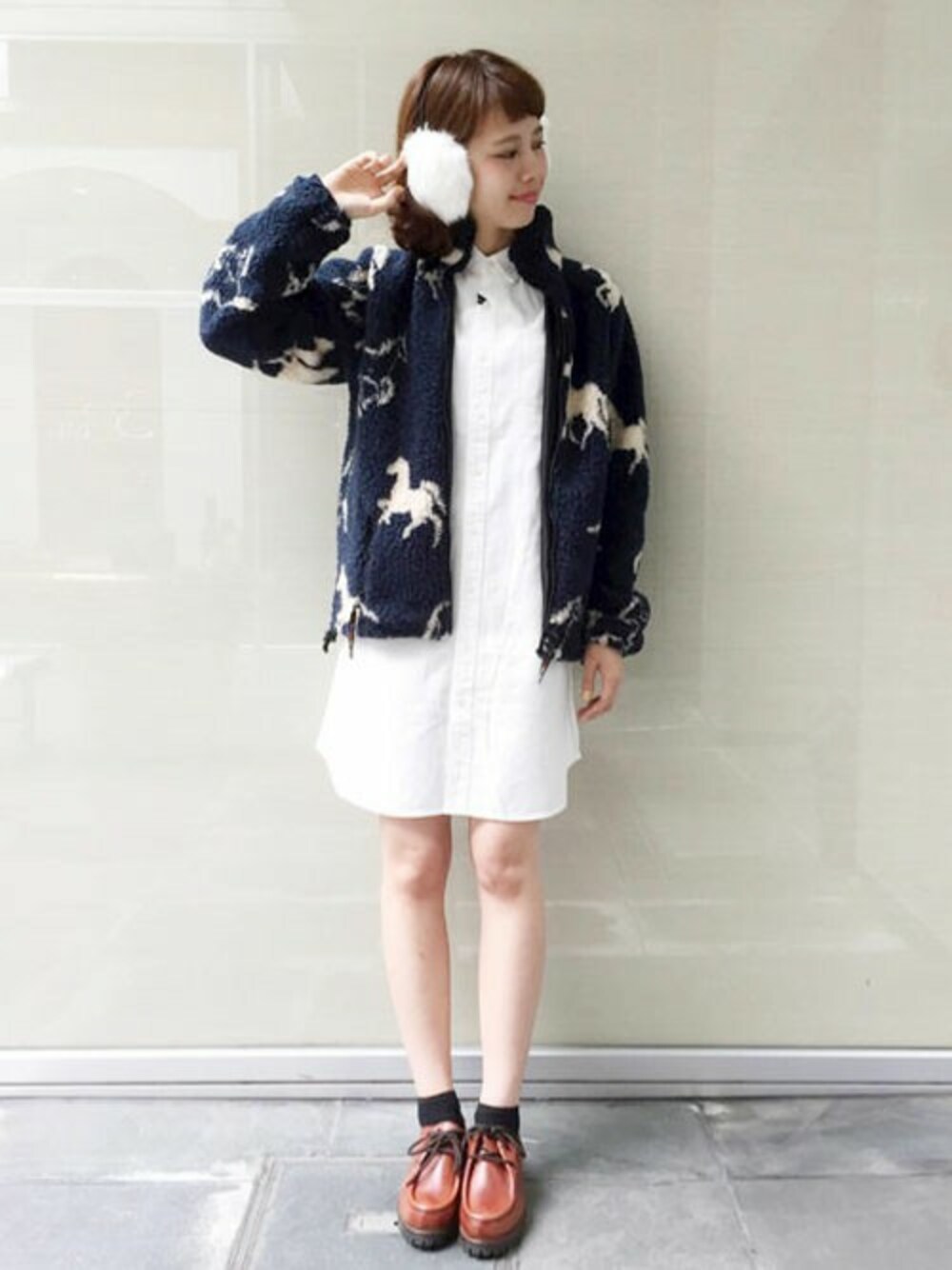 イヤーマフとシャツワンピのホワイトが個性的な羽織の馬柄アウターを引き立てます♪シューズは人気のモカシン。ボリュームがあって可愛いおすすめのシューズです!