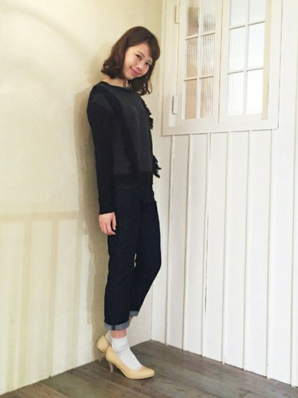 シンプルなコーディネートには珍しいフリンジニットがオススメ◎