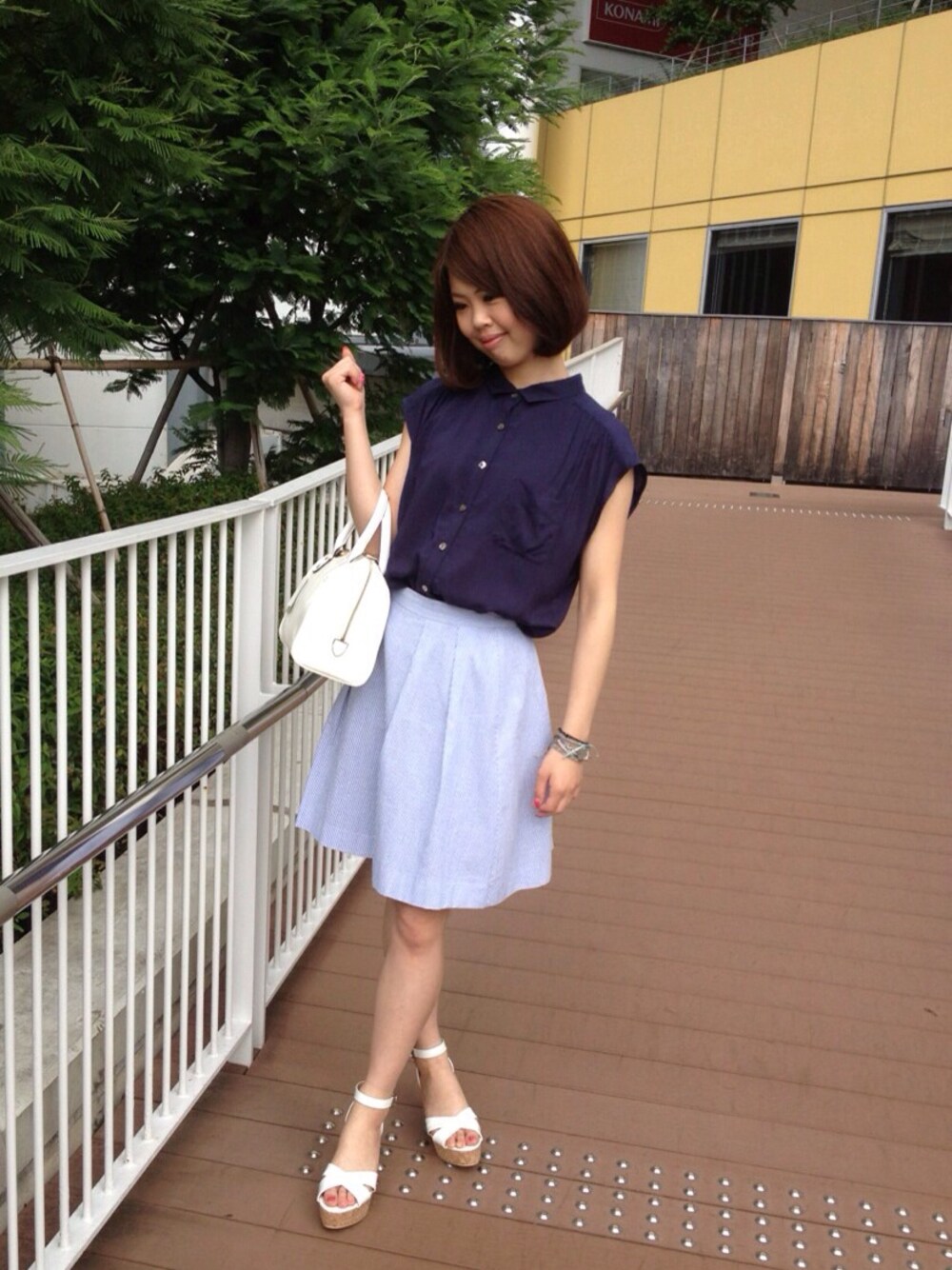 ネイビーのブラウス×ブルーのフレアスカートのキレイ目コーデ。 差し色にホワイトの小物で爽やかに*