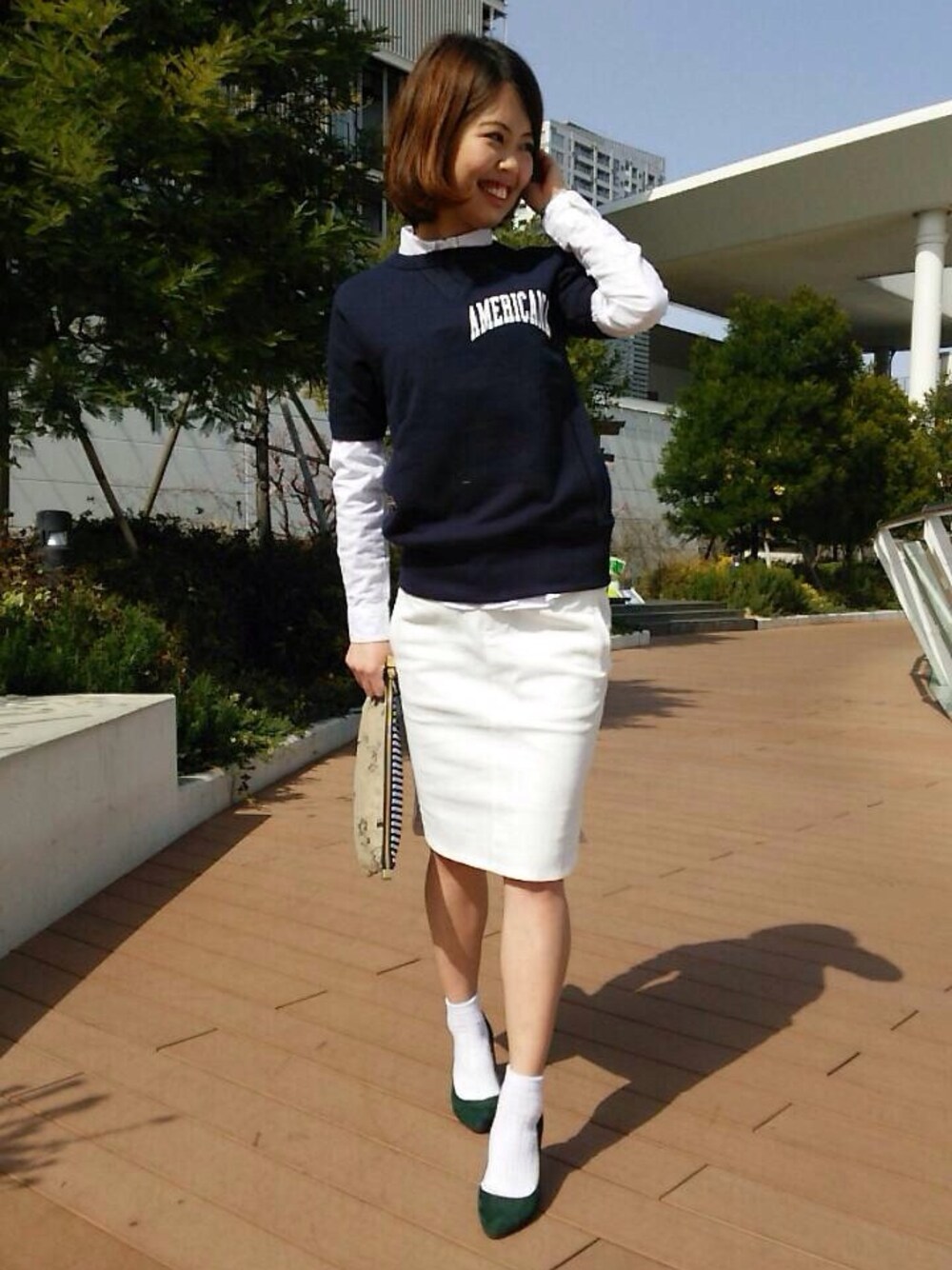 ネイビー×白にグリーンで差し色コーデ* 半袖スウェットも、インナーにシャツやカットソーを重ねれば今すぐ着れちゃいます!
