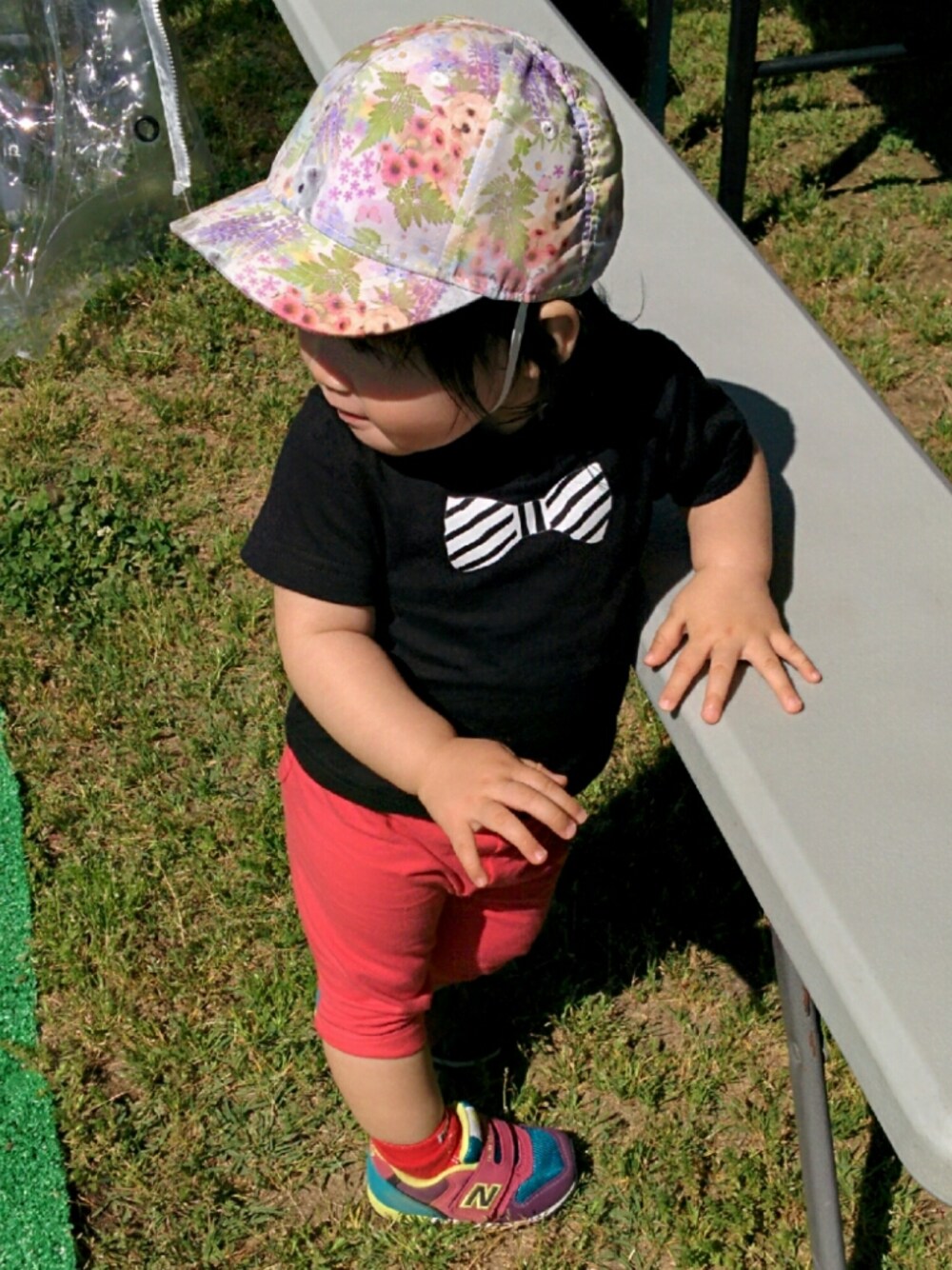 Tシャツはイオンに常に売ってる袋入りの無地シリーズ👕 すくすくデーに買うと380円くらい。 しっかり生地でとっても使えます✌ 黒無地にアイロンプリントのリボン付けました。 ユニクロのレギパンはred表記だけどピンクがかった赤ですよねー