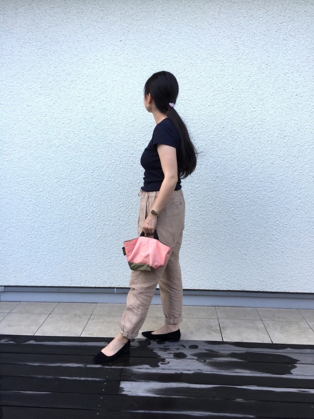似たようなコーデ。 今日も着まわし、バンザイ! (ウッドデッキがぬれているのは、お家プールの後だから🏊🏽👙🐠)