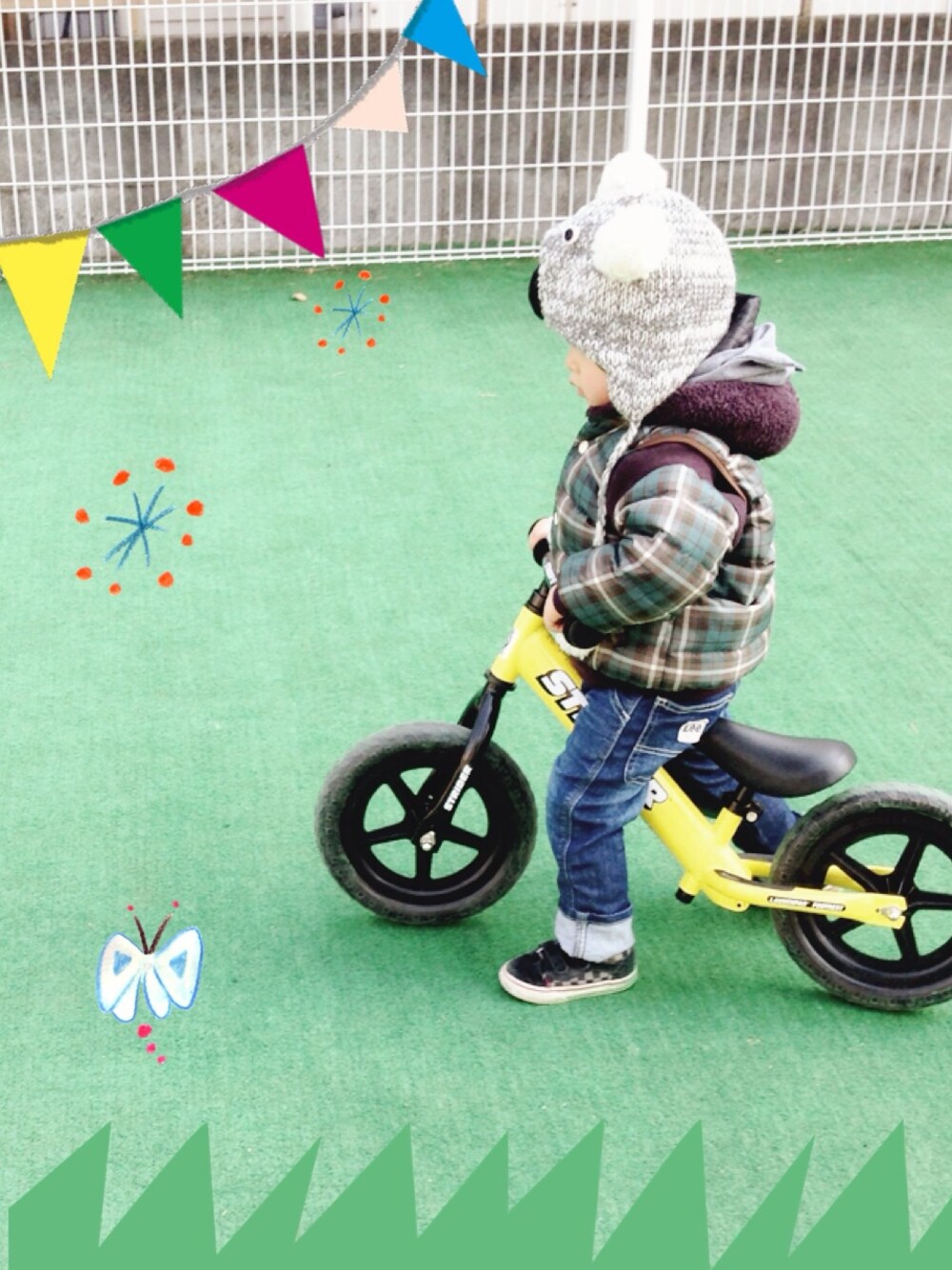 晴れの日、ストライダーの練習中。 アウター: uu パンツ: Lee スニーカー: Van's 帽子: いただきもの
