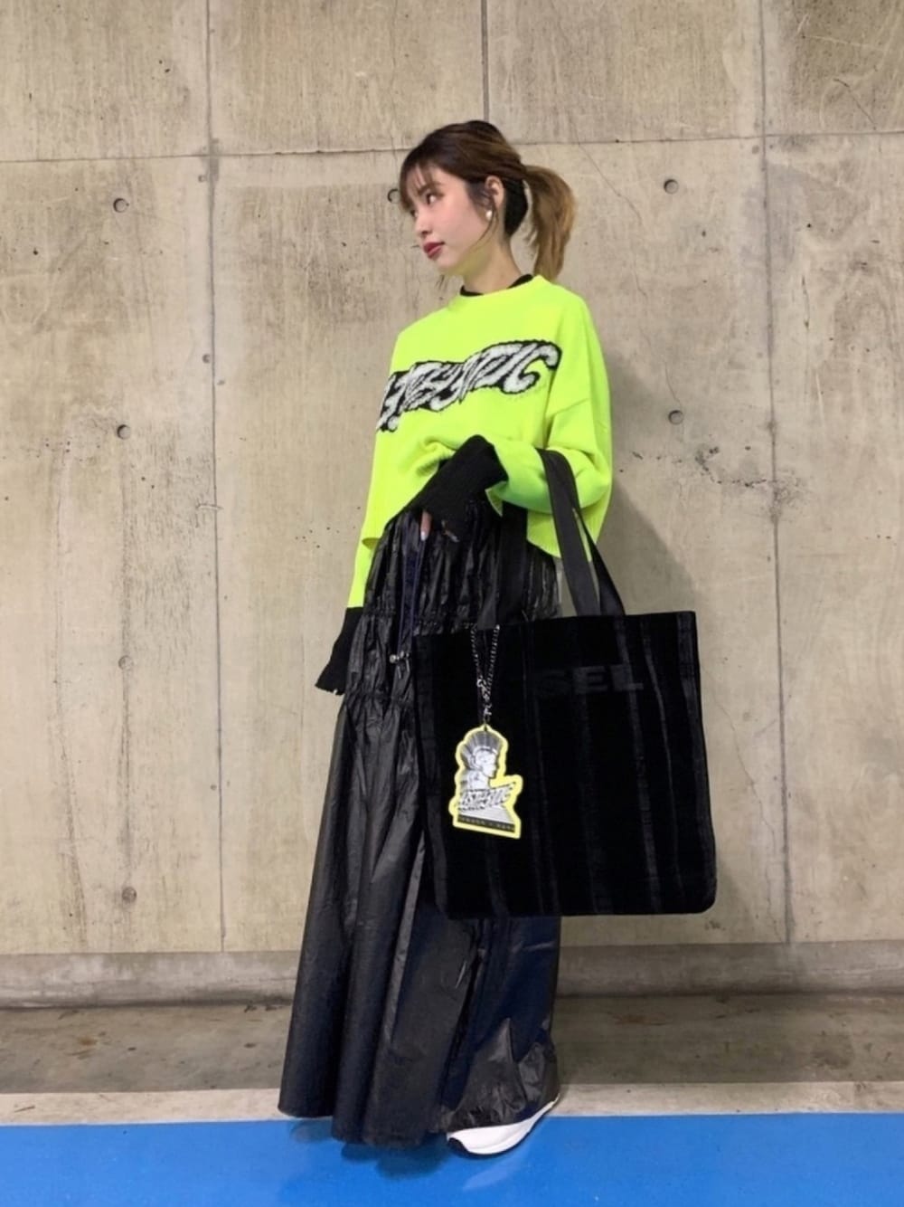 ネオンカラーのニットとナイロンスカートで少しエッジを効かせ、白スニーカーで抜け感を出しています