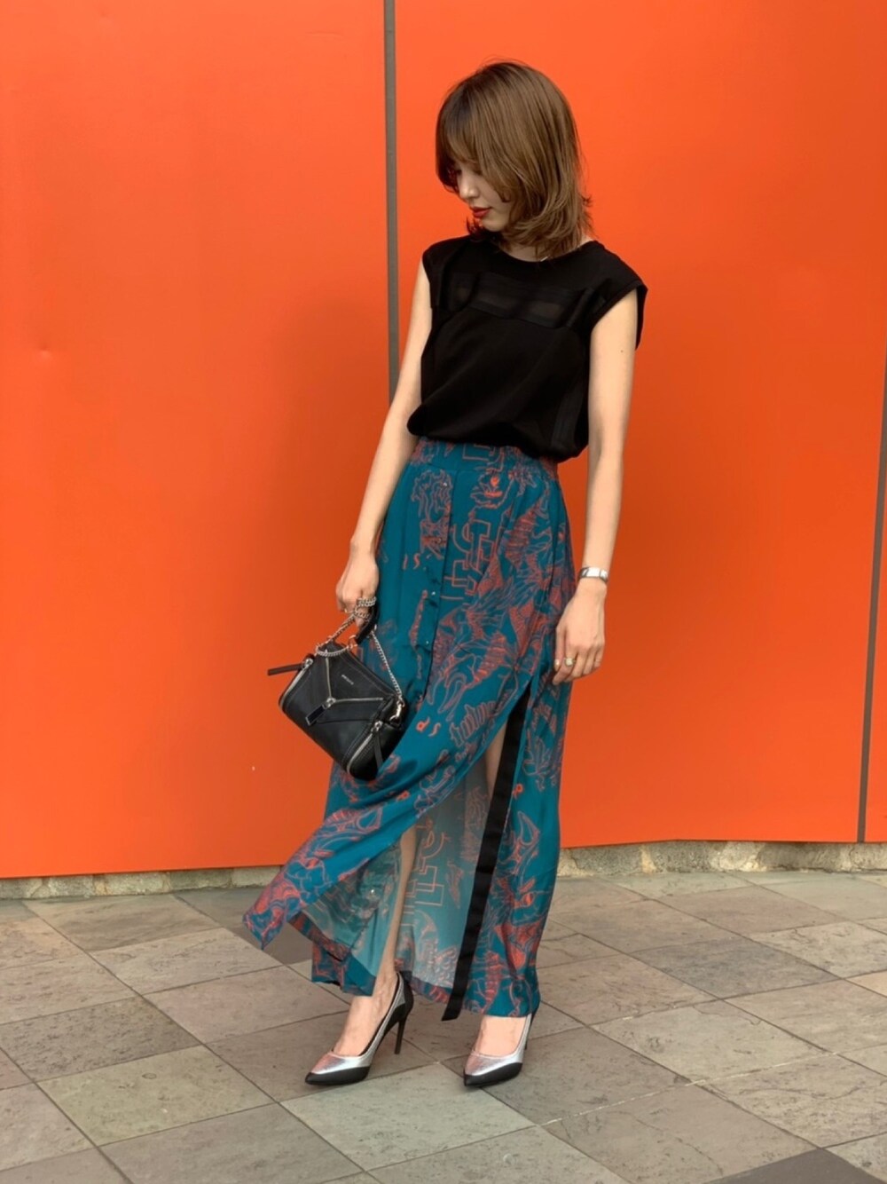 ロングスカート×パンプスで きれいめにスタイリングしました スカートはスリットが入ってるので抜け感が出て◎です 涼しげなお洋服を着ていっしょに夏を乗り切りましょう〜