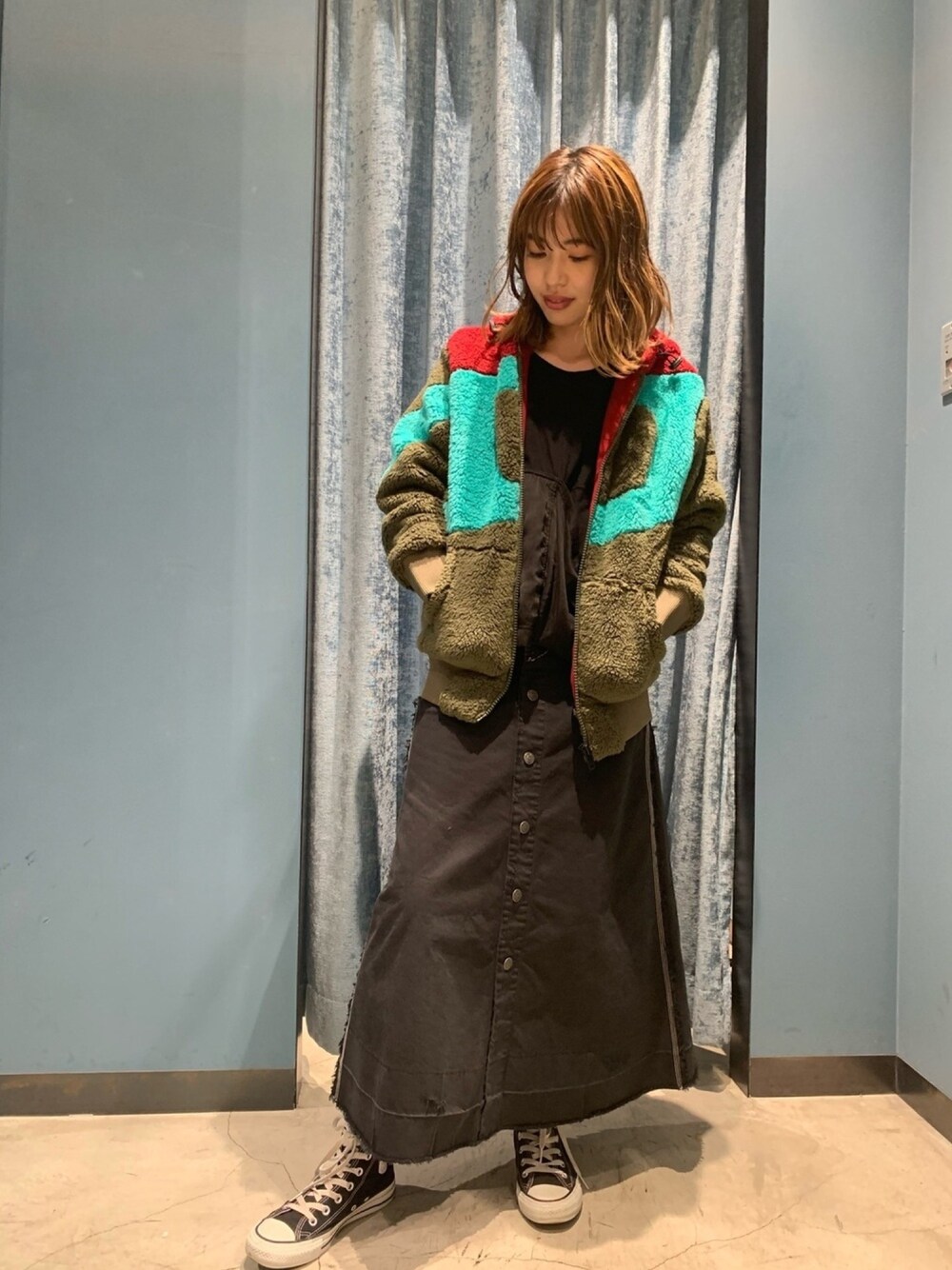 フワフワのスウェットパーカーにスカートを合わせ、カジュアルスタイルにしました👖