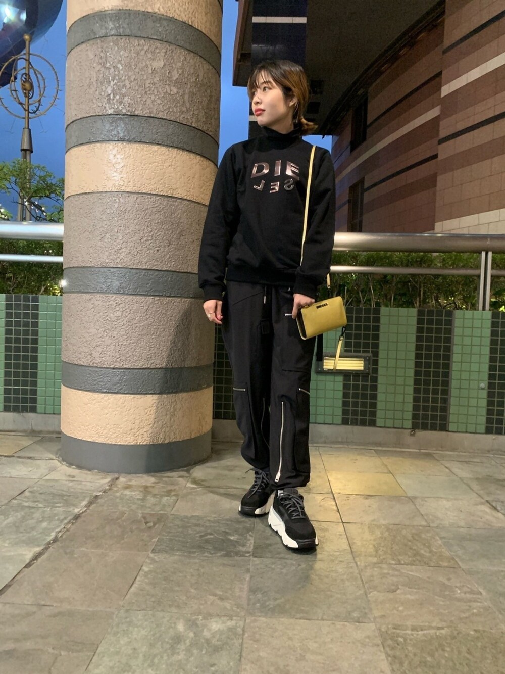 珍しくスポーティな感じに🛹💫 オールブラックにゴールドアイテムをアクセントにし、 見えてないですが白ソックスもチラ見せして抜け感も出しました