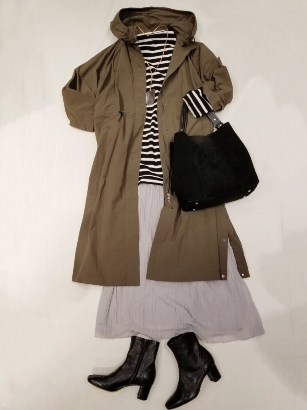 【outer】着用サイズ:F 軽くてサッと羽織りやすいナイロン素材のカジュアルコート。 フードが取り外し可能です。 深く入ったサイドスリットは開閉できるので、開けてプリーツスカートを覗かせると素敵ですよ。