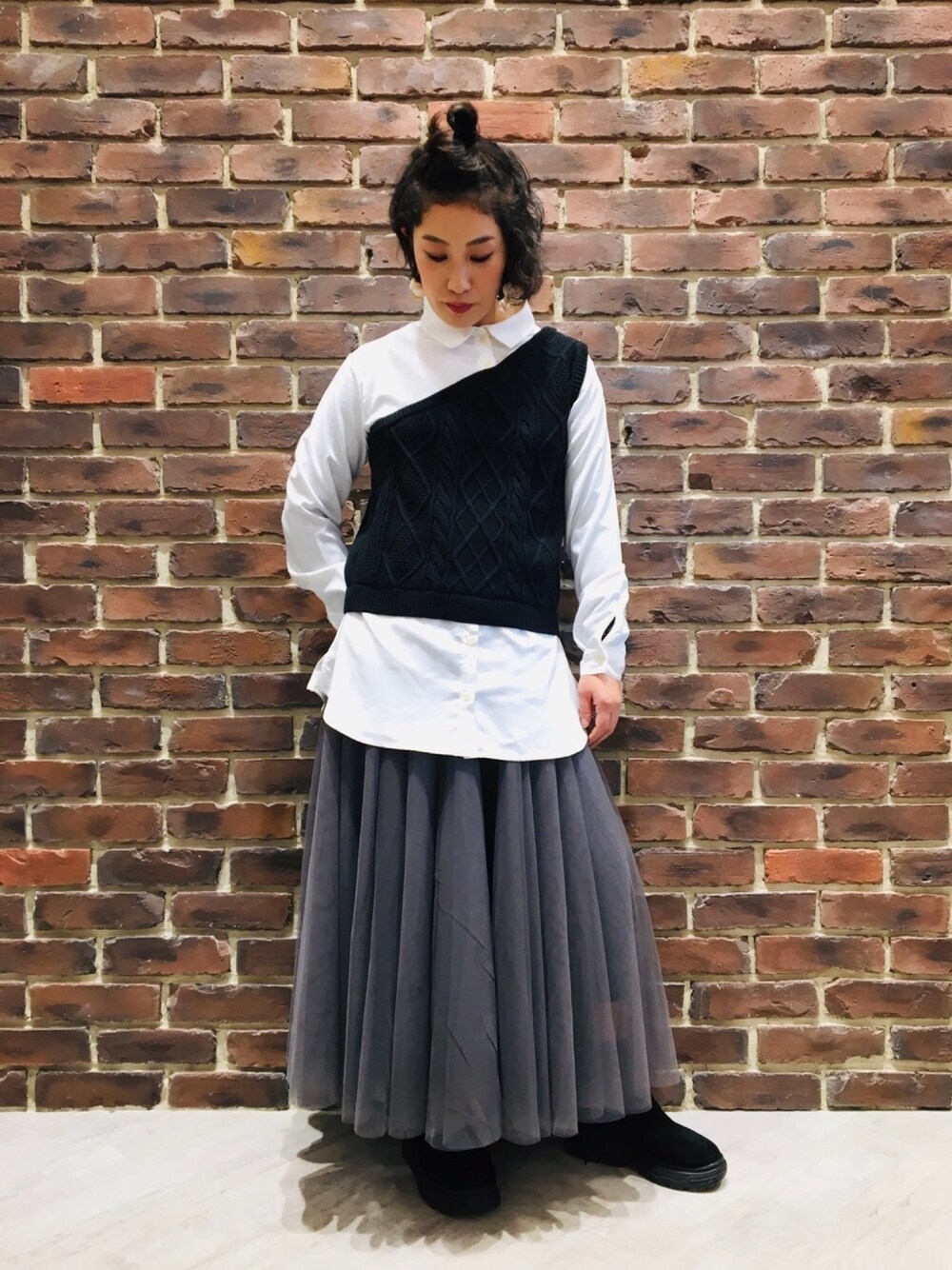 シャツレイヤーオフショルニットに合わせて少しマーメイド感のあるチュールスカートを。 デザイン感満載のトレンドコーデ。
