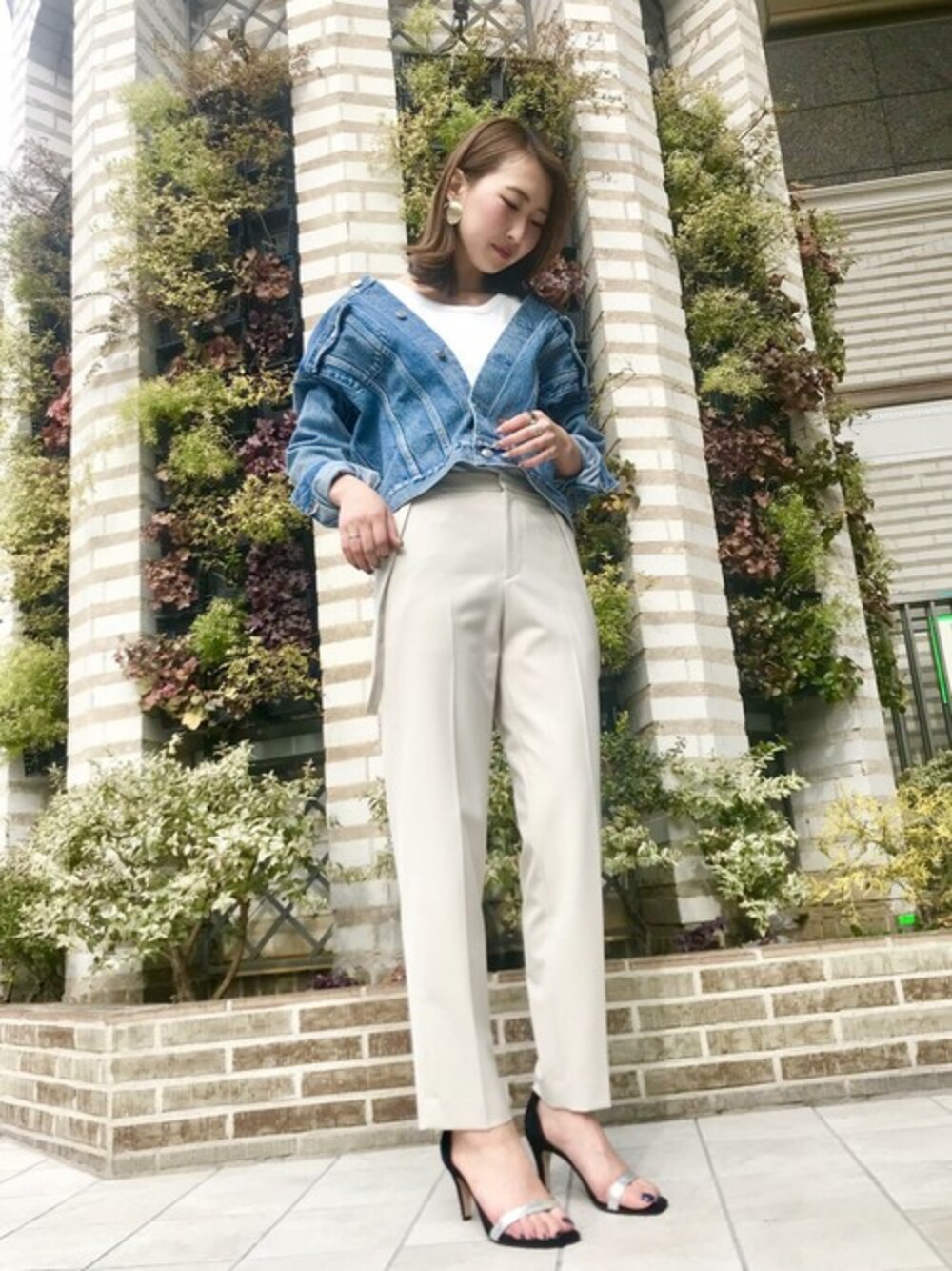大人カジュアル トップスとパンツは白で統一させ春らしさを。 デニムジャケット×サンダルでカジュアル感も出しつつ綺麗目スタイルにしました。 パンツのサスペンダーは取り外しが出来るので、通勤着としてもお使いいただきやすいと思います!