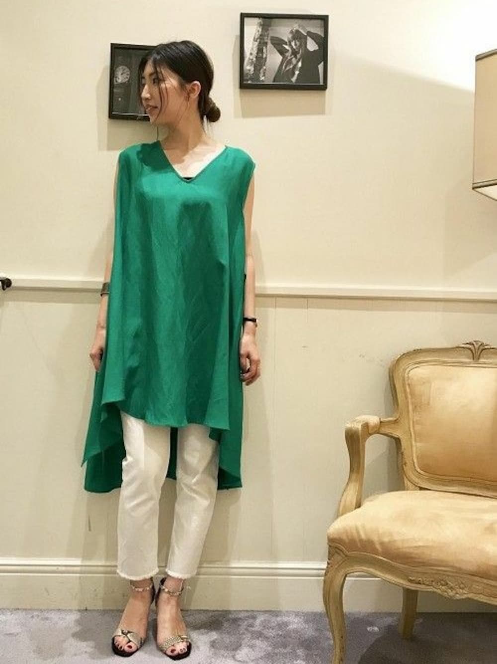 アシンメトリーチュニックワンピース リネン素材で落ち感のあるフレアがきれいなニュアンス上手なワンピース。 ウエストの紐を前や後で結んだり、垂らした状態と3通りの表情が楽しめます。 今年らしくパンツ合わせに、グリーン×ホワイトでクリーンな印象に。