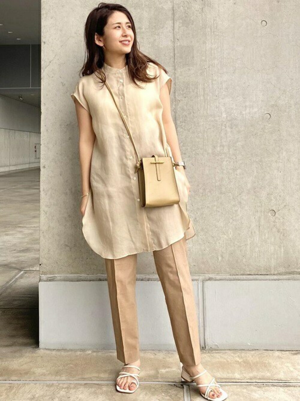 夏のニュアンスカラーstyle! ベージュのニュアンスカラーでまとめトレンド感ある色合いで合わせました! チュニック丈のシャツも透け感が軽やかにみせてくれるので、パンツだけでなくスカート合わせにもオススメです♪ shirt:38サイズ inner:38サイズ pants:36サイズ 京都伊勢丹 ロペ ERIKA 151cm