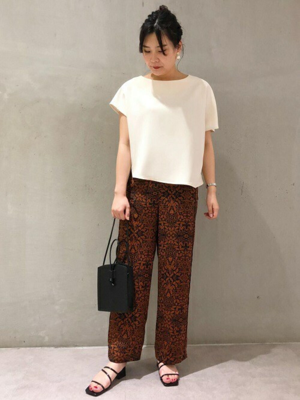 ボタニカル柄! 夏先取りコーディネート ゆったりとした履き心地のリラックスパンツとアシンメトリーのブラウスを合わせてみました。 リゾート感のあるボタニカル柄ですが、つるっとしたサテン素材なのできれいめトップスとも相性抜群です! また存在感のあるパンツですが、ダークトーンで落ち着いた印象で履いていただけます。 アシンメトリーのブラウスはGWC20100とセットアップとしても着ていただけます! 《着用サイズ》 アシンメトリージョーゼットプルオーバー 38 ボタニカルサテンイージーパンツ 38 ルミネ池袋 ROPE' mademoiselle RIO 163cm