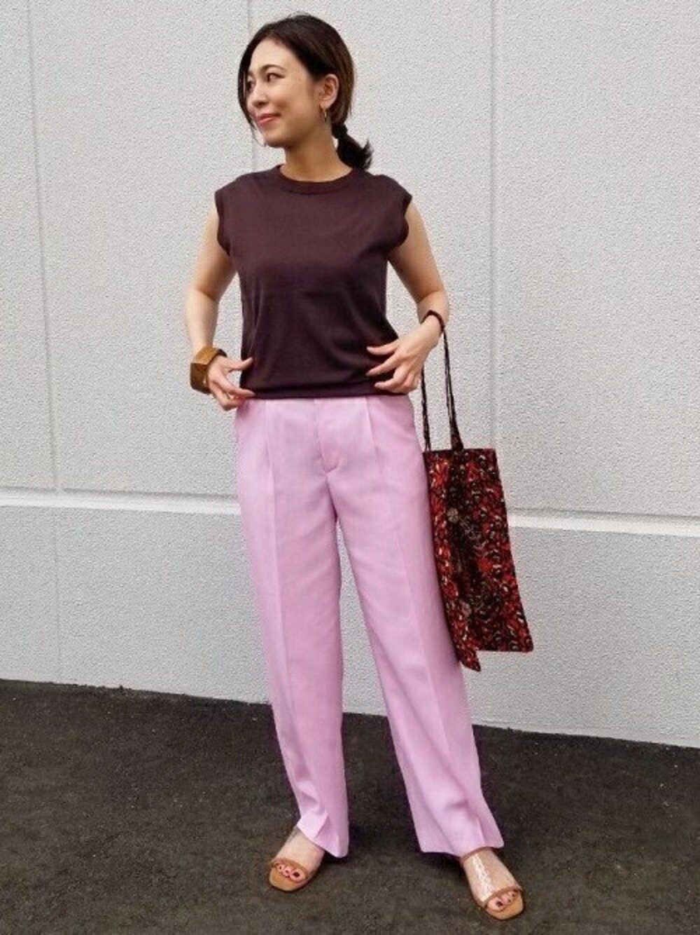 ノースリーブニット カラーパンツにノースリーブニットを合わせました。 深みのあるブラウンの色もノースリーブなので 暗くてなりすぎず、カラーや柄ものと合わせても 相性がいいカラーです。 ノースリーブニットの素材は綿とシルクでとっても肌触りより、お洗濯もできます。 程よくコンパクトなので、ボトムスは選ばず着ることができます。 岡山一番街 ROPE' mademoiselle NAO 154cm