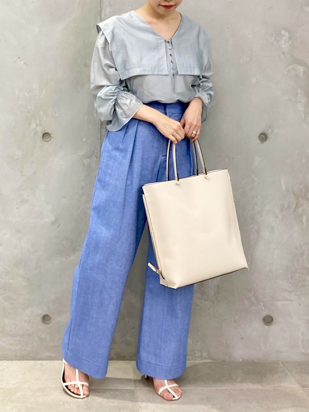 MAAYA / 158cm トレンドのビックカラーブラウスで ブルーカジュアルコーデ