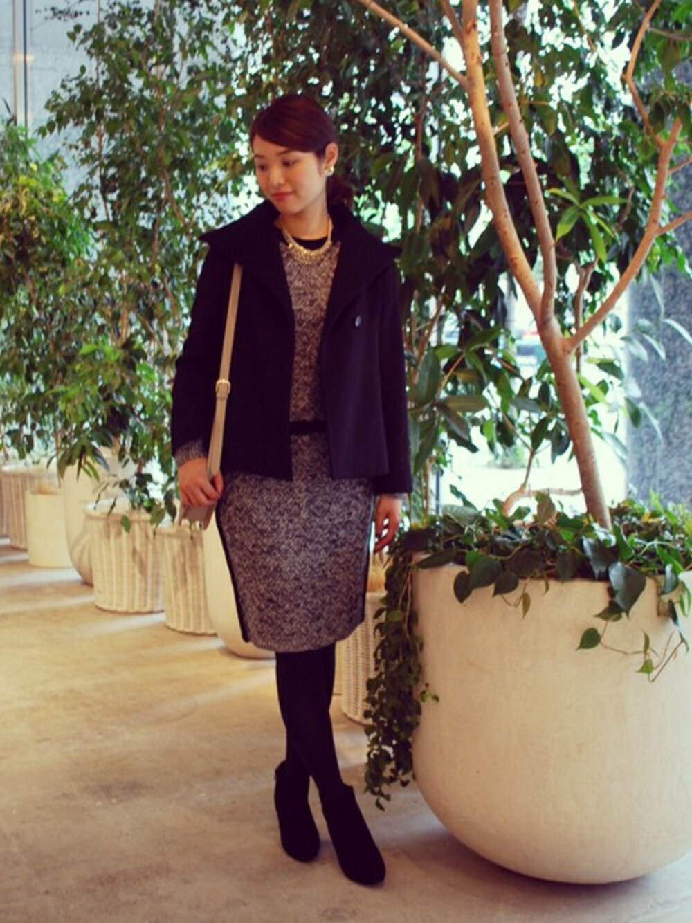 ブラックでまとめた冬のコートスタイル。ツイードのニットセットアップは女性らしいシルエットなので、デートスタイルにもおすすめです。