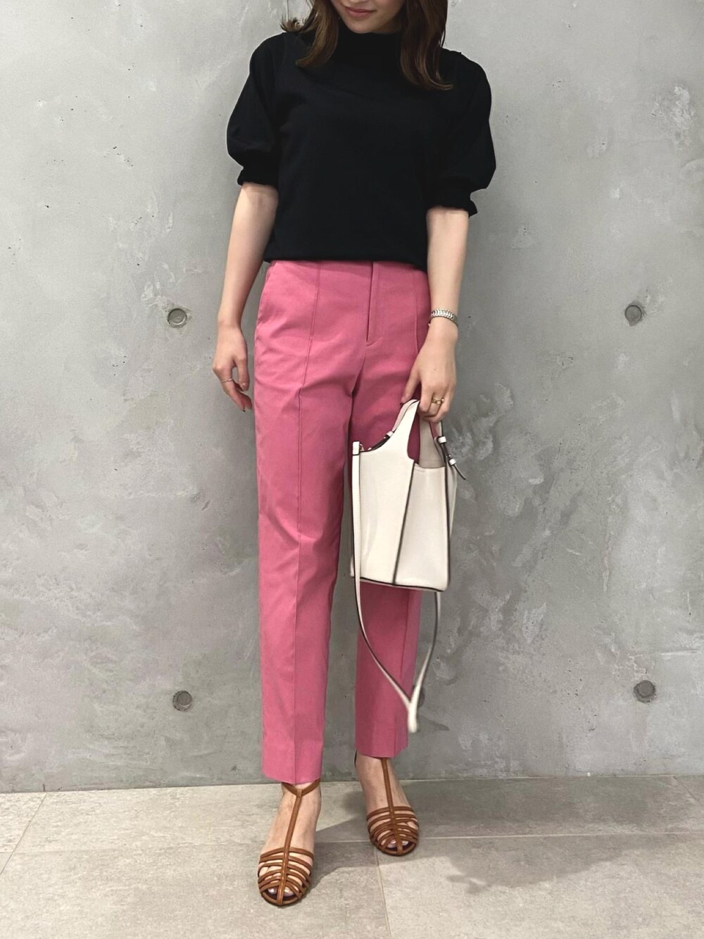 S / 158cm 秋カラーパンツコーデ。 定番のシガレットパンツは 脚をきれいに見せてくれる かつストレッチのきいた優秀パンツです◎