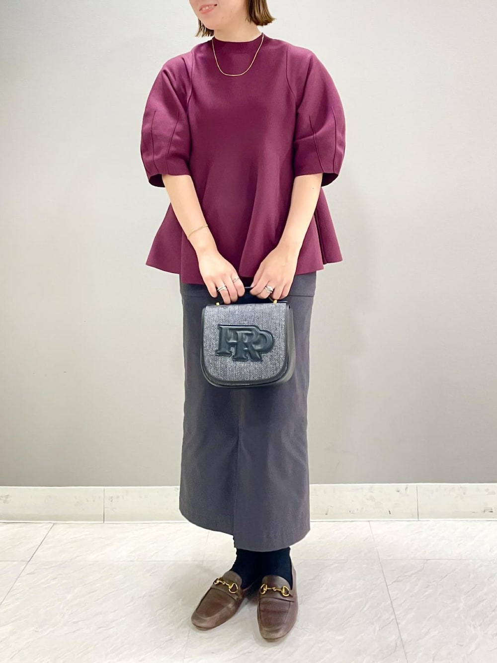 本社 プレスのTシャツ/カットソー「【秋の新作】フルニードルフォルムペプラムニット」を使ったコーディネート