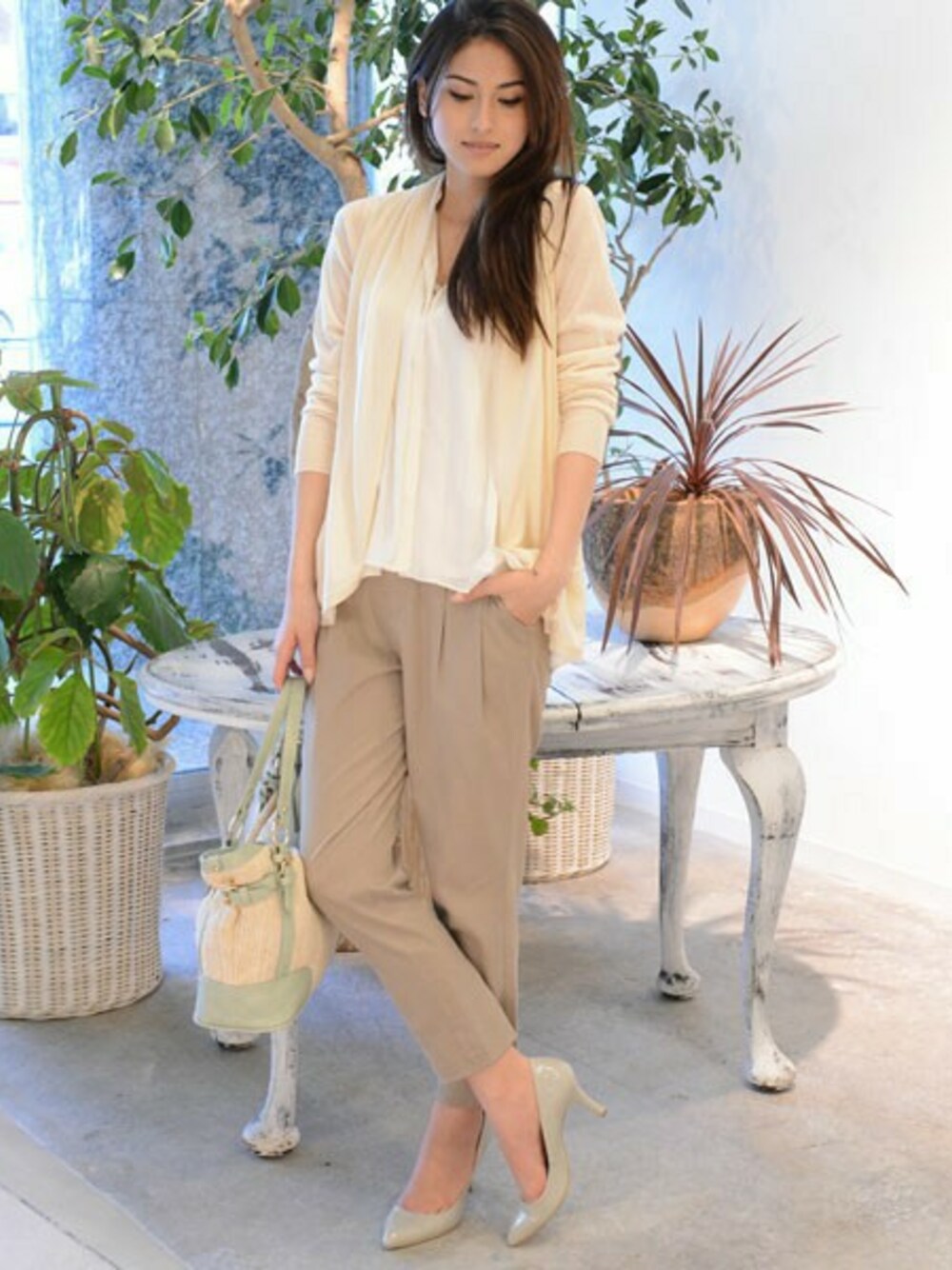 裾へと広がるギャザーが大人っぽくエレガントなブラウスとベージュのカーディガンで夏の通勤スタイル♪ベージュ×ホワイトは上品さと女性らしいやわらかい印象を演出してくれます。
