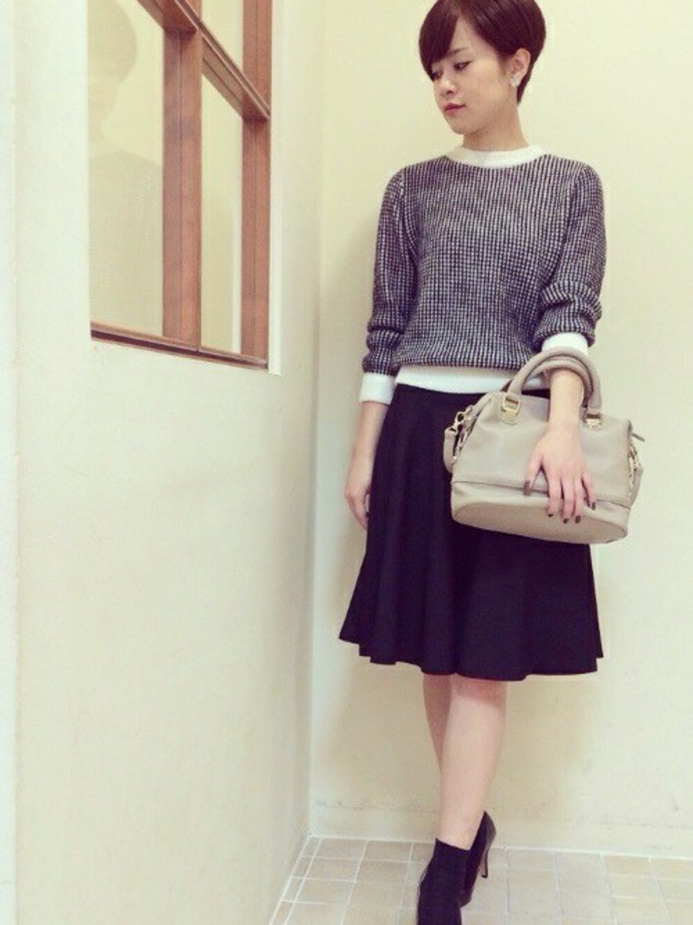 毛足の長いモヘアのニットプルオーバー×ウールのフレアスカートでこなれ感を出しました。 足元はトレンドを意識して、パンプス×靴下で今年らしく。