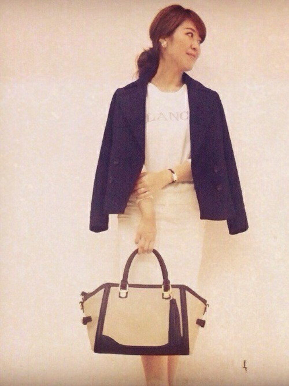 ジャケット風のショート丈Pコートアウターを肩がけでこなれた感じに。 ロゴニットも子供っぽくなりすぎないようにコーデュロイのタイトスカートの白×白コーデでキレイ目にまとめるのがポイントです。