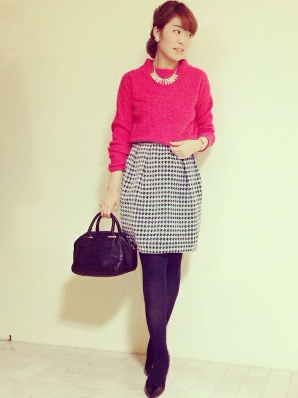 好印象間違いなしの千鳥柄のタックスカートと鮮やかなピンクのざっくりニットを合わせて上品に。 襟元は存在感のあるカットガラスのネックレスで華やかにコーディネートしました。