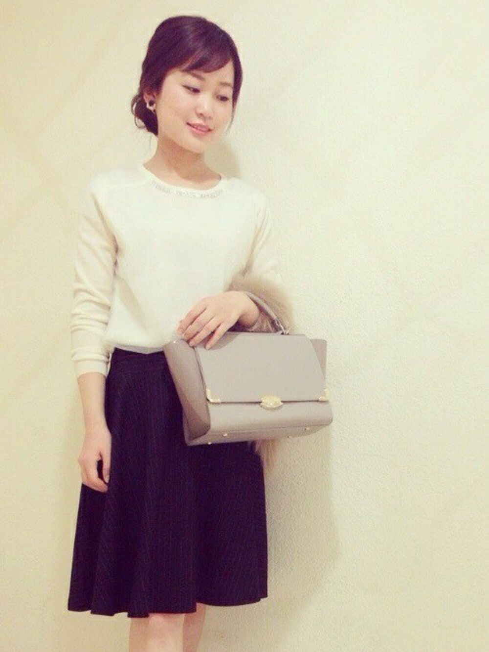 シンプルなニットとストライブ柄のフレアスカートは、上品にFOXファーやビジューのイヤリングと合わせてキレイめに。 髪の毛もゆるくまとめるとかしこまりすぎず首周りもすっきりします。
