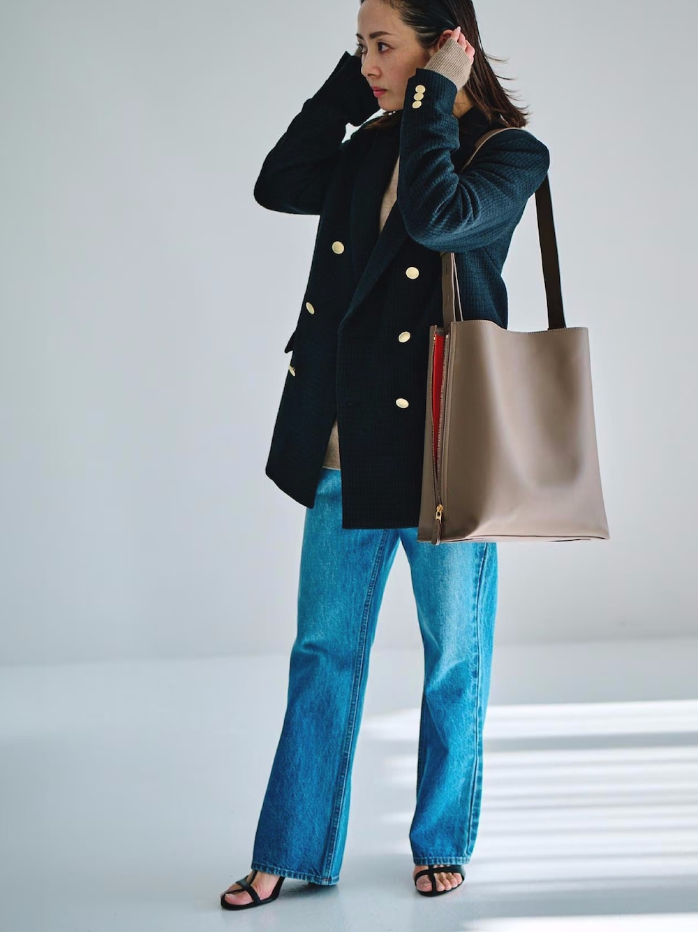 本社 プレスのテーラードジャケット「【雑誌掲載】金ボタン ウール テーラードジャケット(無地/千鳥格子)」を使ったコーディネート
