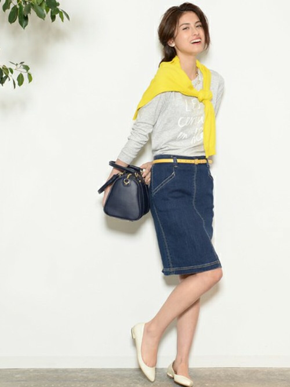 肩かけのイエローがポイントのスタイリング。レタリングが今年らしいプリント!