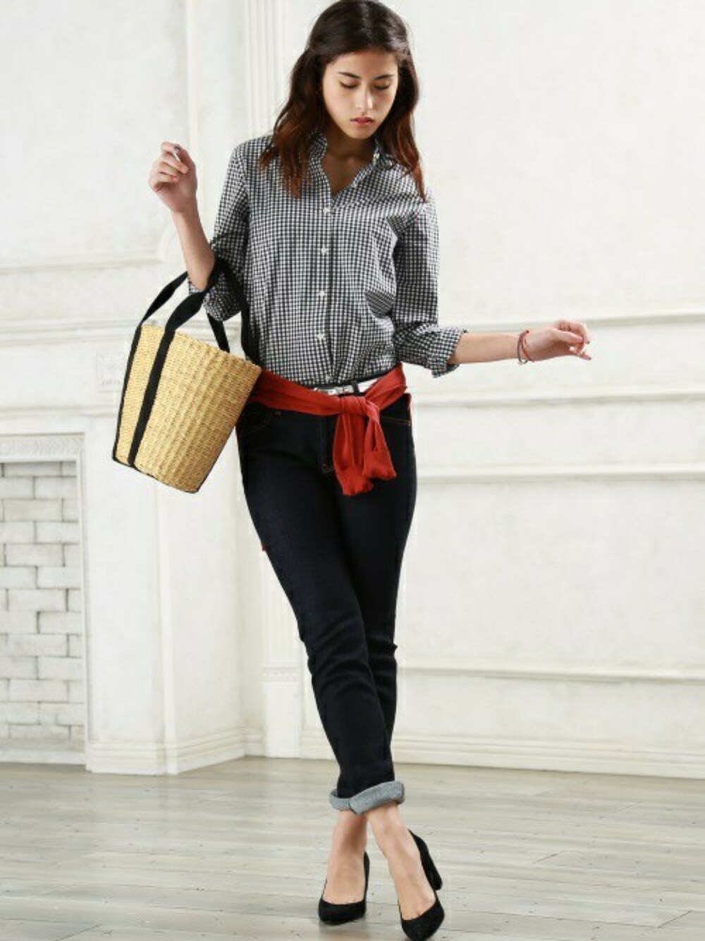 細身のシルエットがきれいな綿素材のギンガムチェックシャツとデニムパンツ。 カーディガンを腰巻に、赤をアクセントにしてさりげない大人の可愛らしさをアピール。
