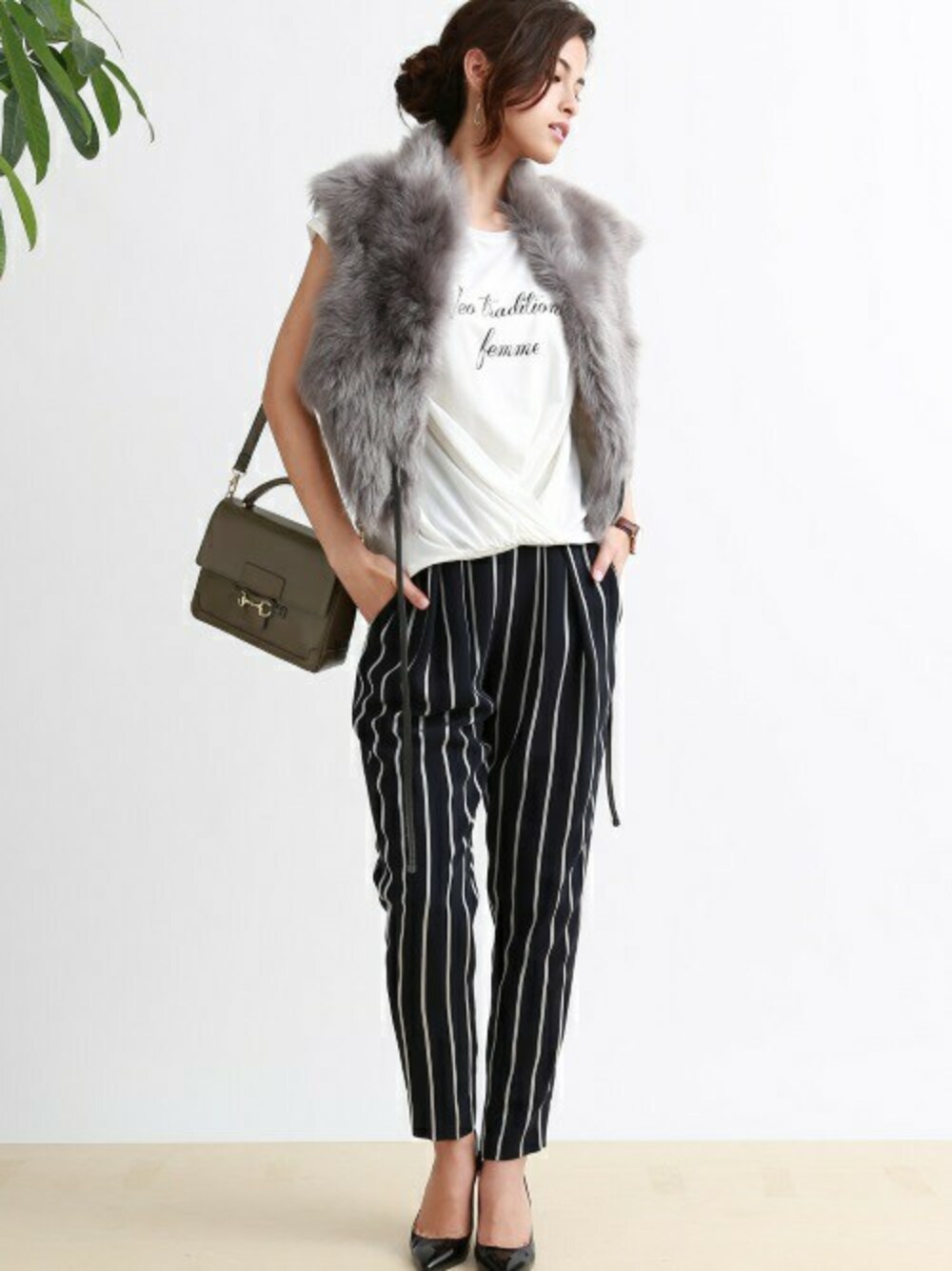シンプルなロゴTシャツにネイビーストライプのタックパンツで今年らしく。 ビット付のショルダーバッグとポインテッドパンプスでカジュアルなスタイルも どこか女っぽい雰囲気に。