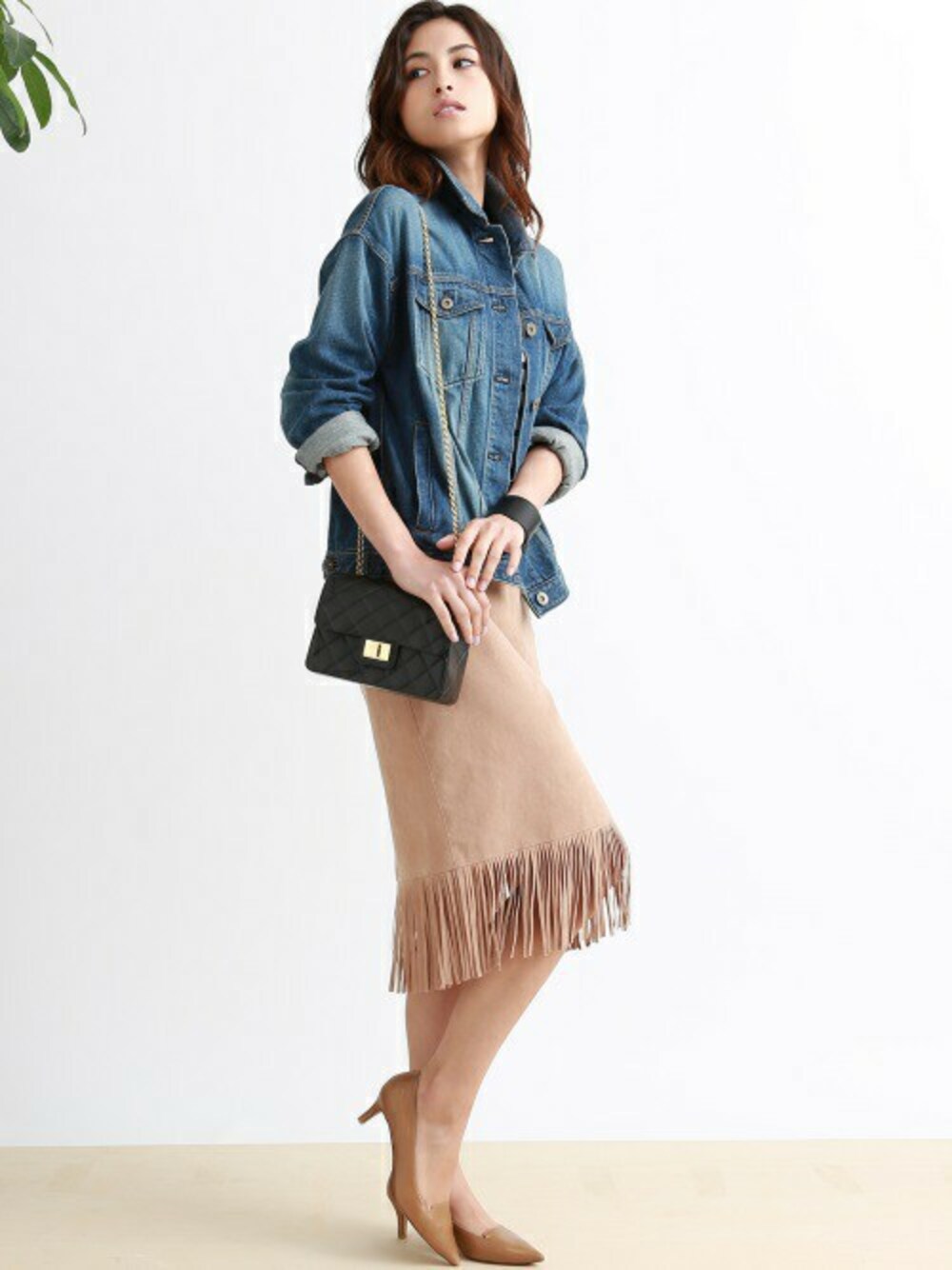 フリンジのスカートは今年のテーマでもある「70’S」を彷彿とさせるボヘミアンアイテム!! ロペのフリンジスカートは着丈も膝下とカジュアルになりがちなデザインも大人っぽく着こなしていただけます。 引き続き人気のGジャンと合わせて甘辛MIXにコーディネート。 DESIGN INVERSO(デザインインヴェルソ)のチェーンバッグは、 ビニール素材でプチプラなのにどこか高級感があって気軽に使っていただけます。