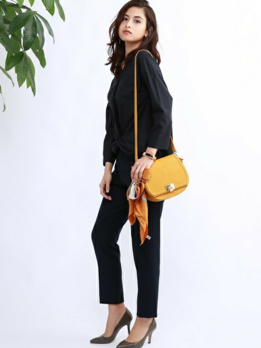 Vネックのニュアンスブラウスにシンプルベーシックなテーパードパンツ。 マスタードカラーのショルダーバッグを合わせるだけでグッと秋らしい印象に。 ショルダーバッグにスカーフを軽く結ぶだけで女度UP!