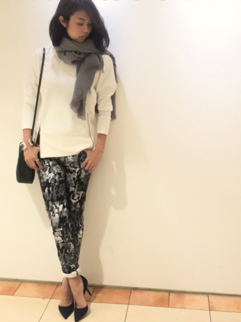 シンプルなスウェットには 柄のパンツでモードに♡ モノトーンがマンネリ化しない、 新鮮なマーブル柄が お気に入りポイント!