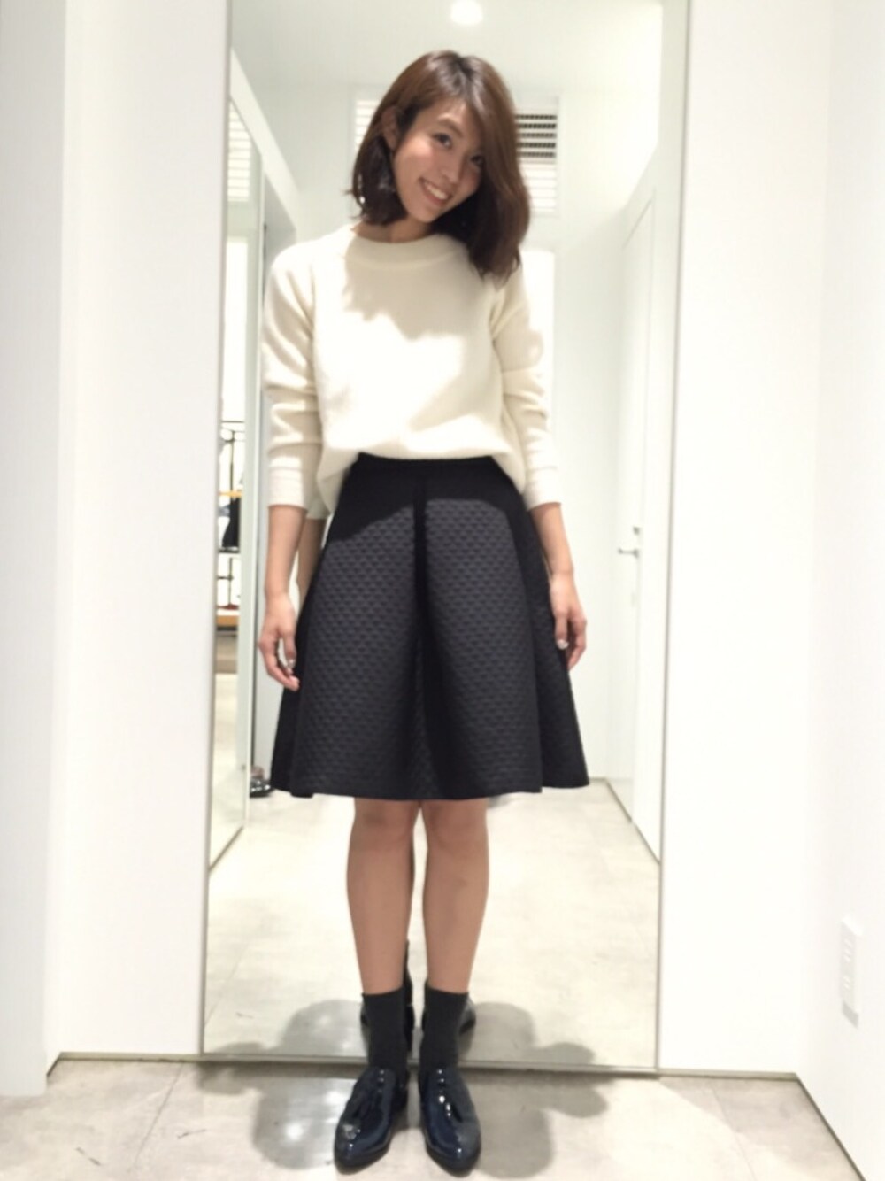 お気に入りのニットと、 キルティングがおしゃれな フレアスカートのコーディネート👗 足元は、あえてメンズライクに。