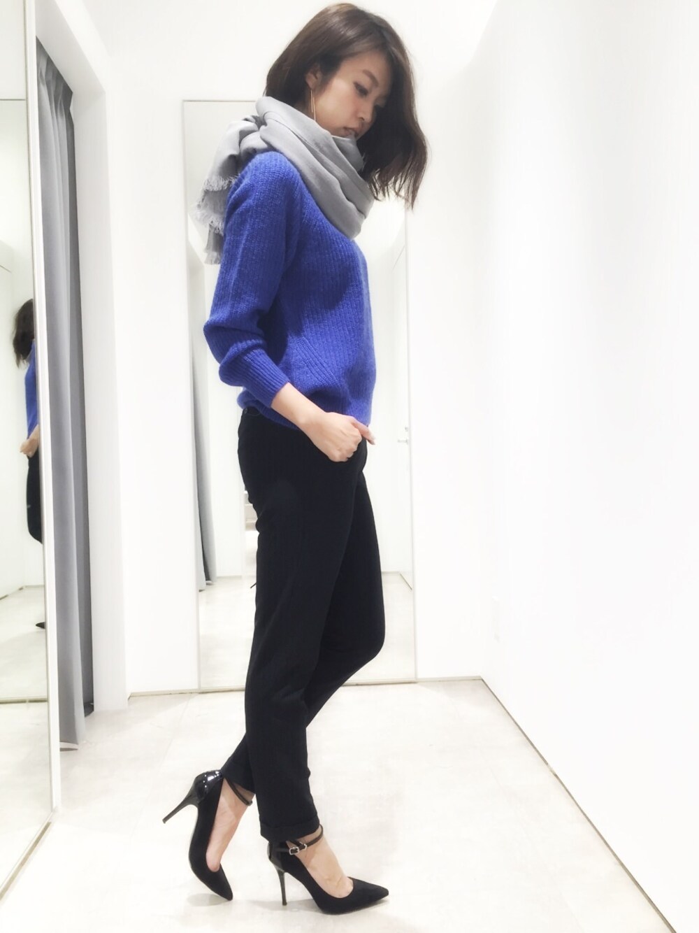 はっとするような、 綺麗なブルーに ピンストライプの ラフなパンツに、 ピンヒール👠を合わせて♡ マフラーはぐるぐる巻きで!