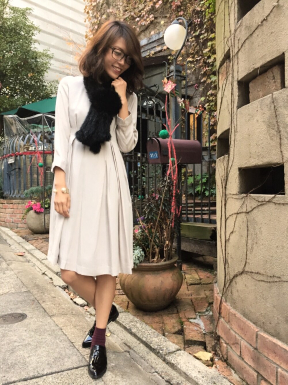 シルエットがきれいなワンピース 女の子らしいのが 得意ではないので、 小物でカジュアルさをプラスしました👓