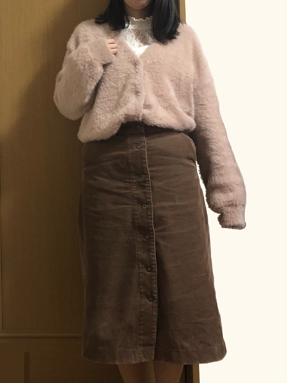 まりんのスカート「コーデュロイフロントボタンスカート(ハイウエスト・丈短め64~67cm)」を使ったコーディネート