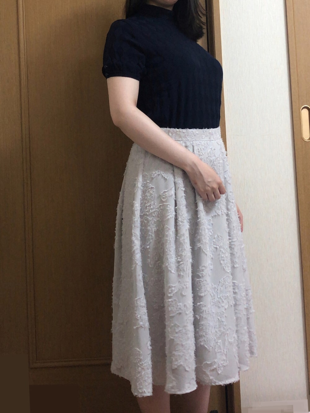 ブルー系のニット/セーター、ホワイト系のスカートを着用したレディースの夏コーディネートの1枚目の写真