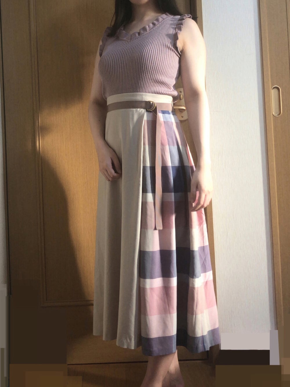 まりんのニット/セーター「BACKリボンノースリニット」を使ったコーディネート
