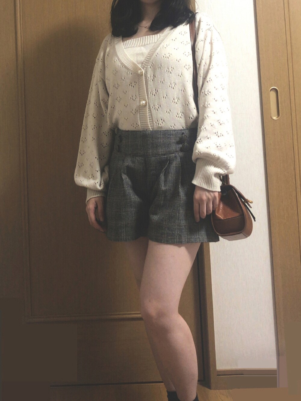 久しぶりにショートパンツを履きました🧸 最近買ったapresjourのボレロカーディガンと合わせてみました☺ 袖が眺めで萌え袖になるのが可愛い💕 ショルダーバッグは母の妹のお下がり! 形がコロンとしてて気に入ってる🌷