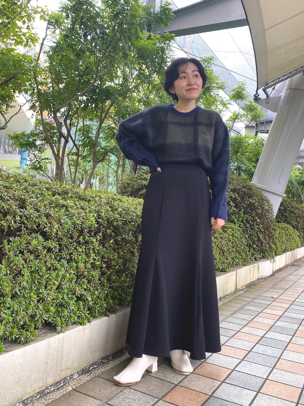 落ちついた配色でまとめてみました! [tops] 着用サイズ:FREE ざっくり大きめな柄のチェックが他にない1枚。 肉厚で真冬まで活躍します。この日の気温では暑いくらいの保温性でした。 サイズ感も緩すぎず、コンパクトな印象。 [skirt]着用サイズ:FREE 大人気のハイウエストスカート。わたしもBLACKは購入済みで今季1番くらいはいています!わたしの身長でもスニーカーでいけます! [shoes]着用サイズ:37 ヒール5cm。サイドジップで着脱も楽ちん。 ※撮影時のみマスクを外しています