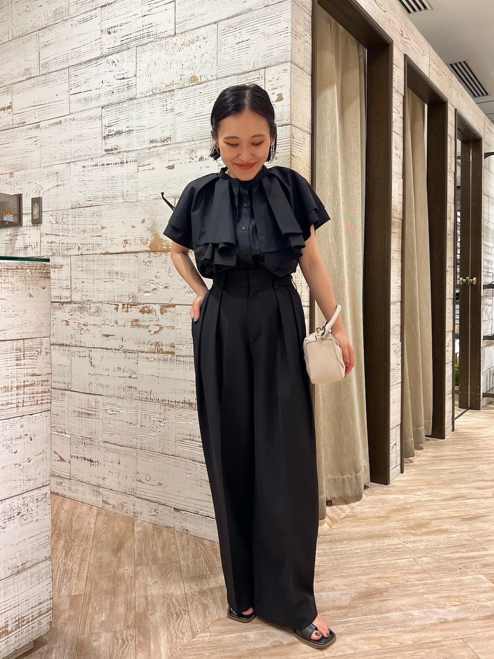 ----------------------------------------- コーディネート見ていただいて、ありがとうございます! ※STAFFOFTHEYEAR20232次審査投票もお待ちしてます! ※毎週日曜日21:00 インスタライブしてます 【@mari.kana_lemage】 是非Instagramもフォローしてください! ----------------------------------------- オールブラックコーデ [tops] 着用サイズ:FREE 晩夏にぴったりなフリルシャツ。微光沢の素材できちんと感もでます!ノースリーブなのでアレンジもしやすいですよ。 [pants]着用サイズ:36 大人気のワイドパンツ。インスタイルも2タック入りですっきりきまります。ヒールありが低身長さんの着こなしポイント。 [shoes]着用サイズ:38 (37完売のため、サイズは37で合います) ヒール6.1cm 普段23.0〜23.5cm