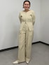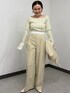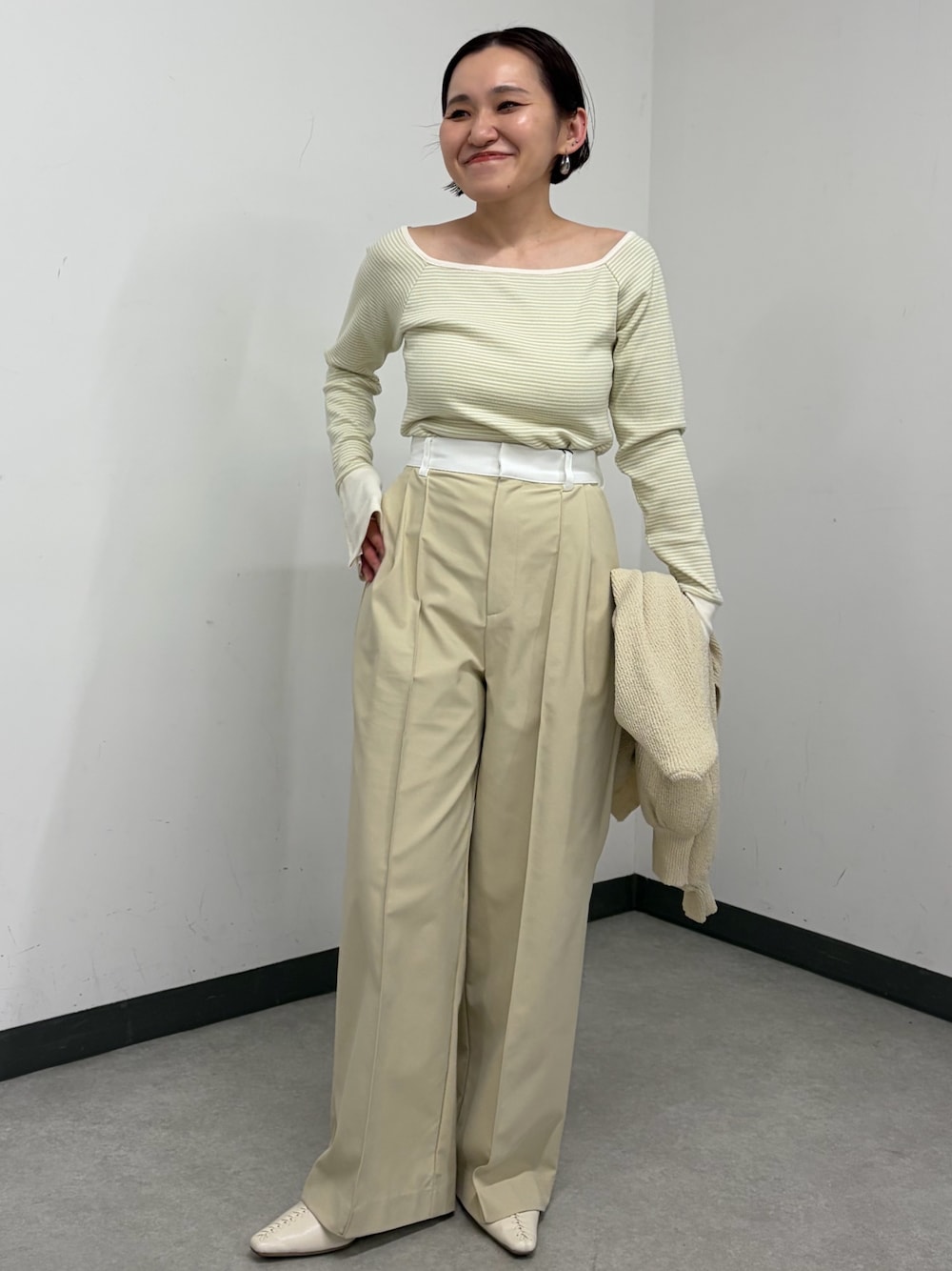 ベージュコーデ [tops] ボーダーの優しい配色がかわいい。 首がスクエアネックで女性らしいデザイン。袖の切り替えもアクセントに。 羽織っているカーディガンは、腰回りまで丈があるので体型カバーにも⚪︎Wジップで抜け感も出せます [pants]着用サイズ:36 ポリエステル100% ヒップスタイルがすっきり見えるゴムなしの仕様。ダーツが入っている為、腰回りをゆとりなくジャストサイズで着たい方におすすめ。