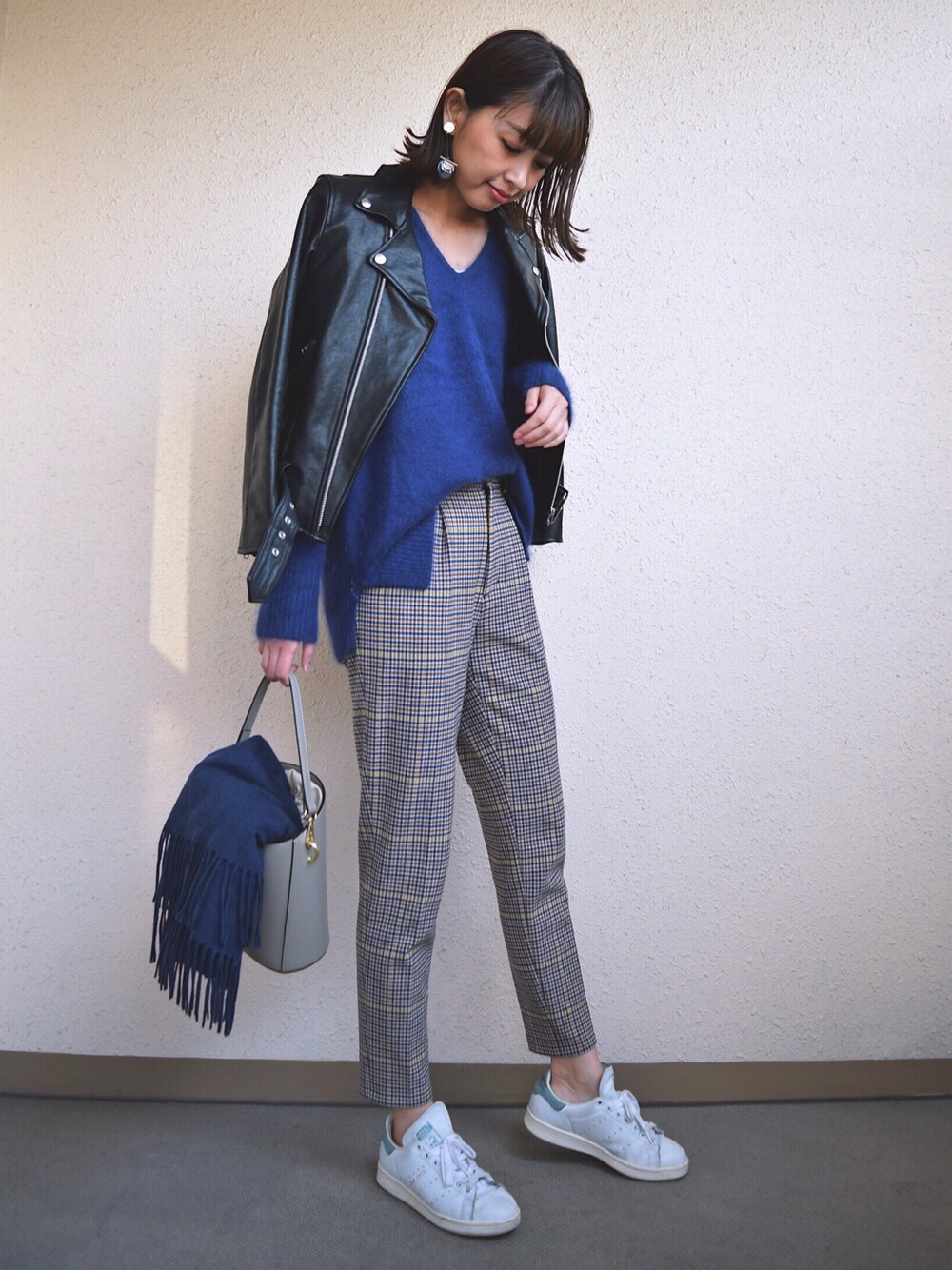 Instagram📱☞m_stylingpage 見て頂きありがとうございます😊 今日はブルーのニットにお気に入りのチェックパンツ😸