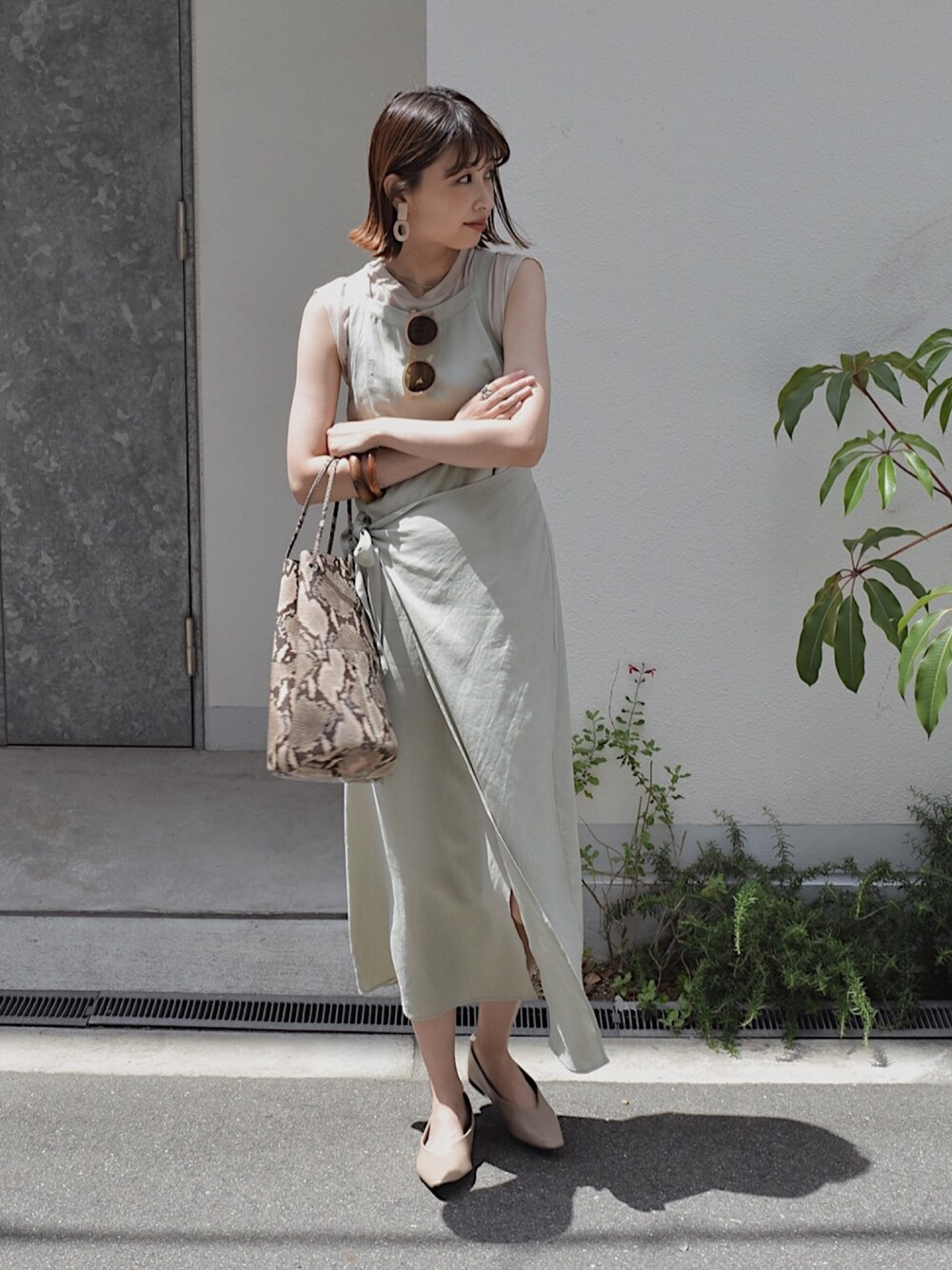 ちょっと前のコーデ! 最近気になるミントグリーンのエプロンワンピ パイソン柄のBagでアクセントつけました♪ 見て頂きありがとうございます♪ Instagram:mariko____wear
