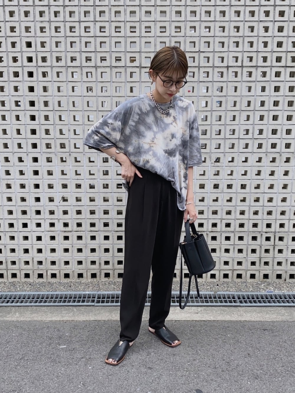 よく着てるタイダイTシャツ。 テローンとした生地がすごく着やすく、お袖も長めが嬉しい♪ ブラックのテーパードでモノトーンに。 見て頂きありがとうございます😊 Instagram