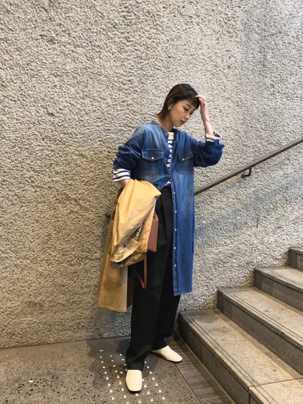 MARIKOのシャツワンピース「大人のデニムアイテム デニムバンドカラーワンピース」を使ったコーディネート