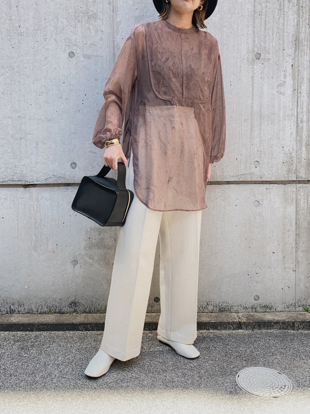 マーブル柄のシースルーが大人っぽくて可愛いブラウス キレイ目に白のスラックスで合わせました💡 あえて中にtシャツ合わせとかも可愛いはず✨ 見て頂きありがとうございます😊 Instagram 👉mariko____wear